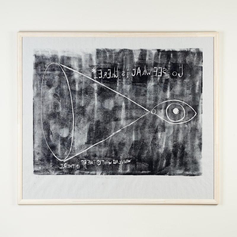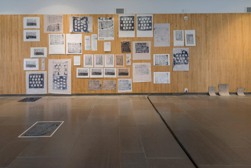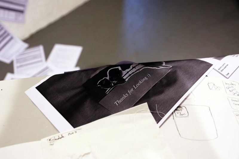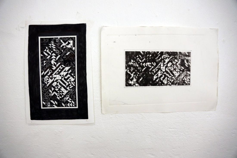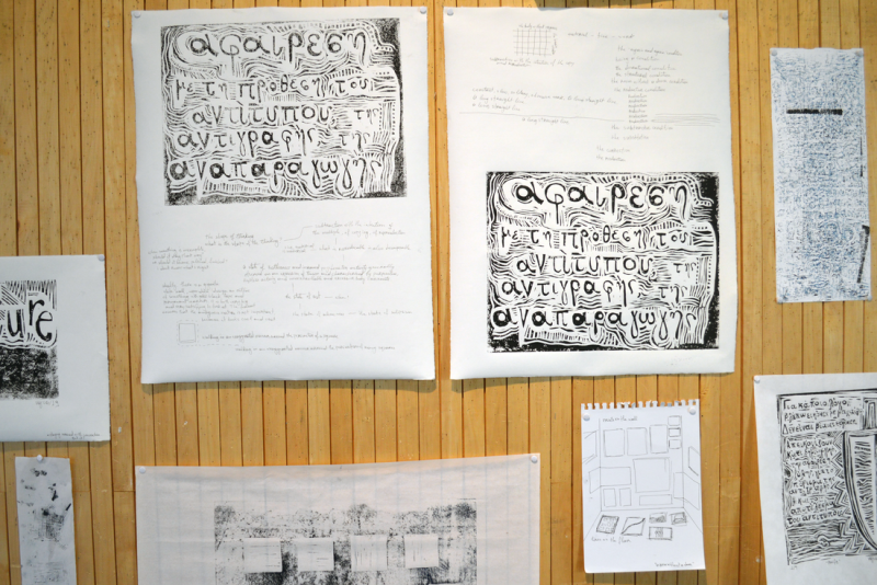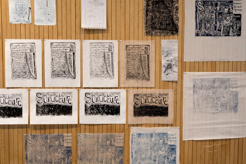 Notes ii included a series of prints, sketches, notes and carved linoleum. The artworks included imagery and phrases based the theme of artistic process and its transparent presentation within the final art object. Words such as structure, reproduction and subtraction as well as grid formations and repetitive line formations heavily featured.