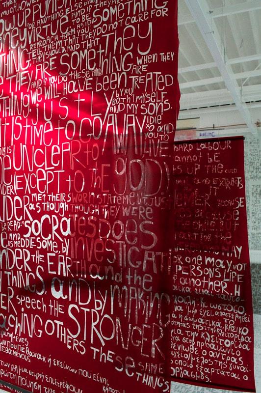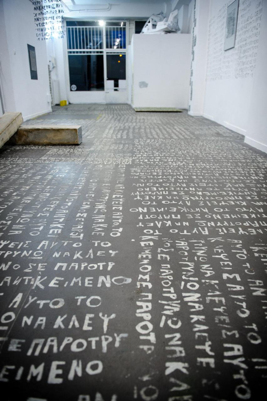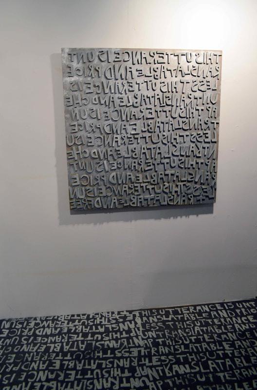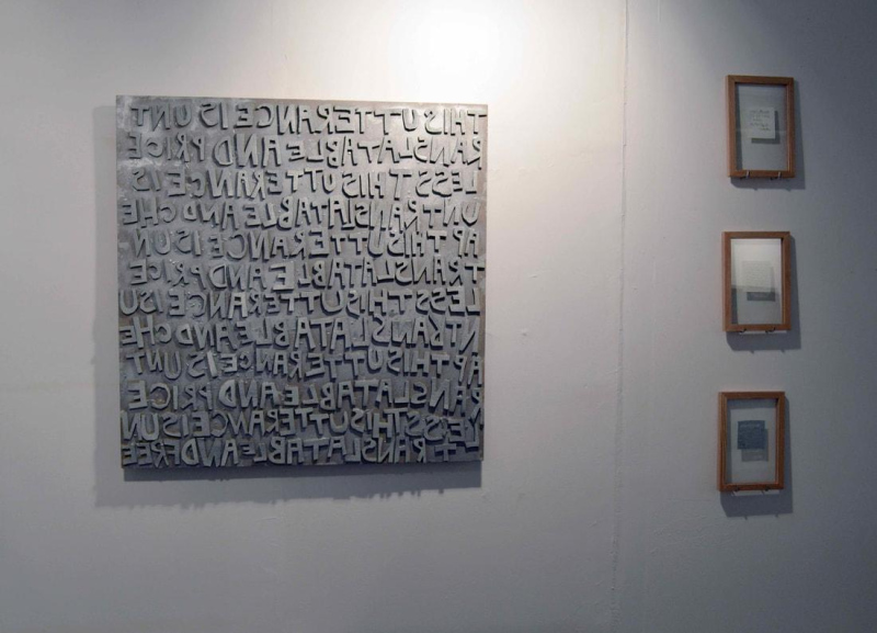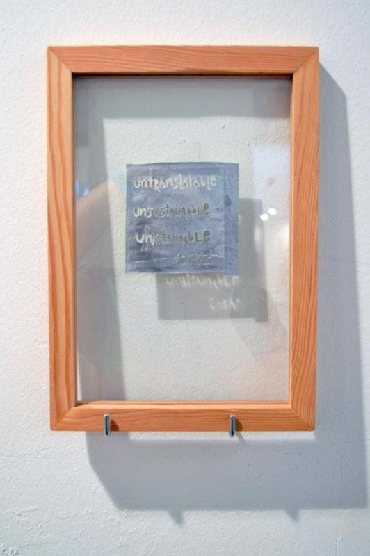 Participating artist in Art Athina with Alibi Gallery, Athens Conservatory, Athens, Greece, 2018Commissioned for the Art Athina Art Fair by Alibi Gallery in 2018. A 1sqm stamp was used to stamp the temporary vinyl flooring of the booth and read: THIS UTTERANCE IS UNTRANSLATABLE AND PRICELESS. THIS UTTERANCE IS CHEAP. Three stencils on post-it notes were encased in double-sided glass and placed by the stanp. Texts such as: AT THE SUPERMARKET 1+1 FREE IS NEVER A GIFT. YOU PAY FOR IT SOMEHOW. and UNTRANSLATABLE UNSUSTAINABLE UNATTAINABLE CHEAP were carved into the small stecils and added to the themes of the works; values within written language in the art field.