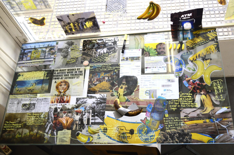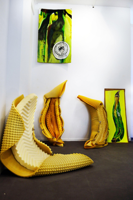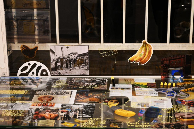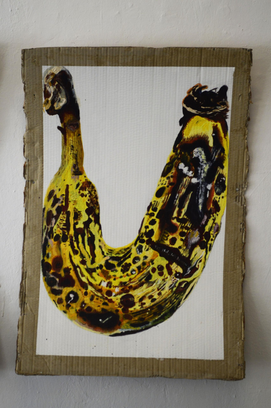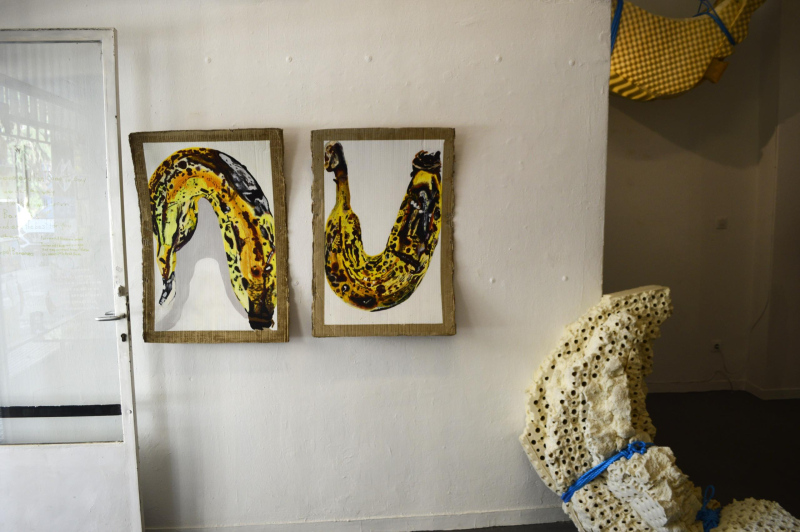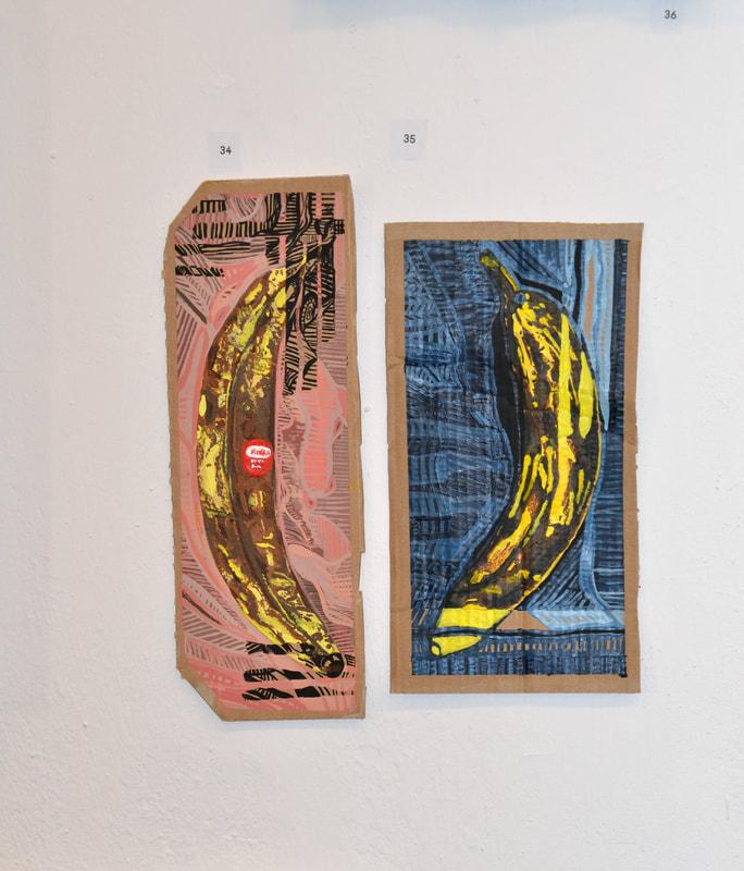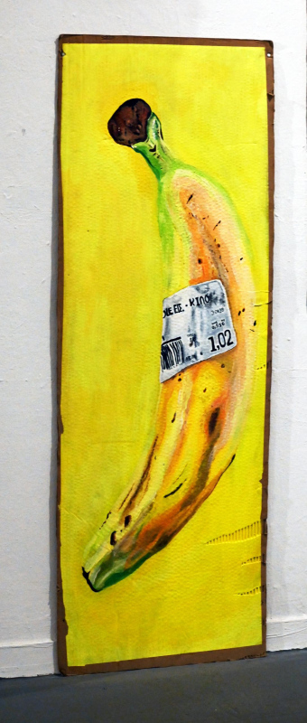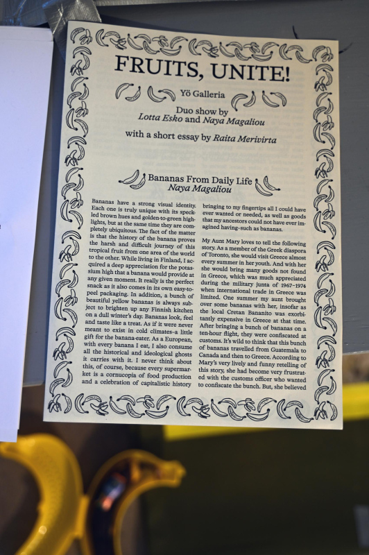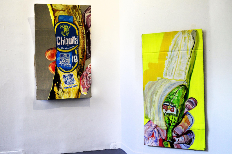 The collaborative project investigates the histories and symbolisms of bananas. It delves deep into the context provided by the common and oversaturated symbol of the fruit through large-scale paintings on found cardboard and large sculptures by Lotta Esko carved from found materials. Fruits, Unite! asks questions about why we consume tropical fruit in the West and how we view bananas in popular culture.