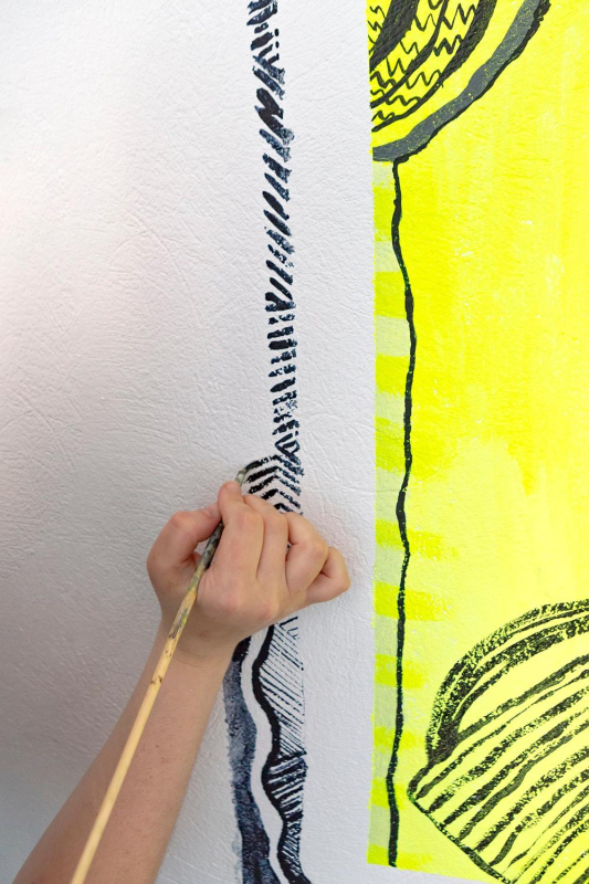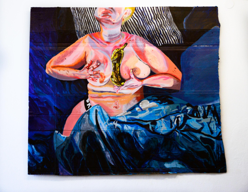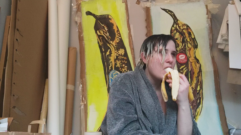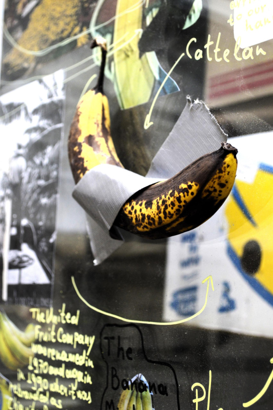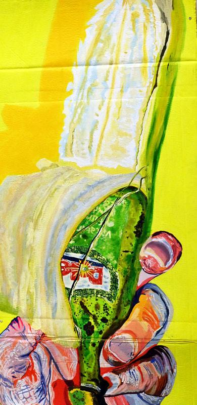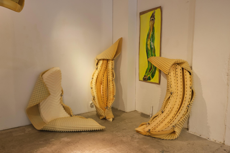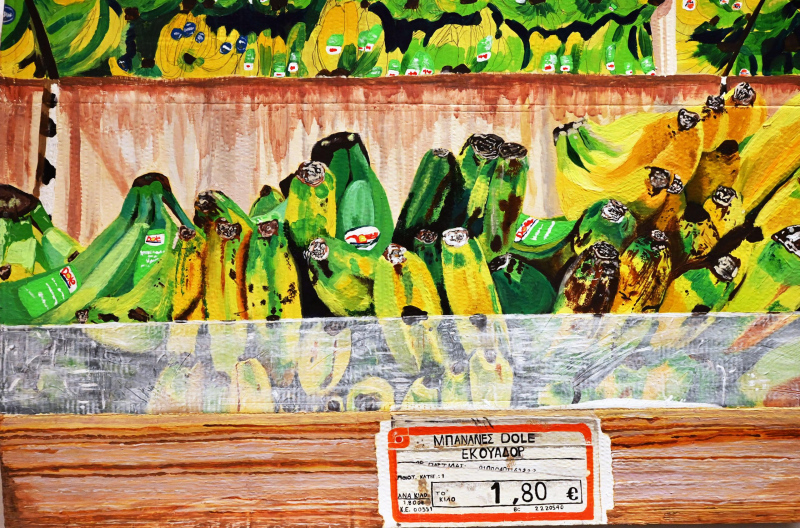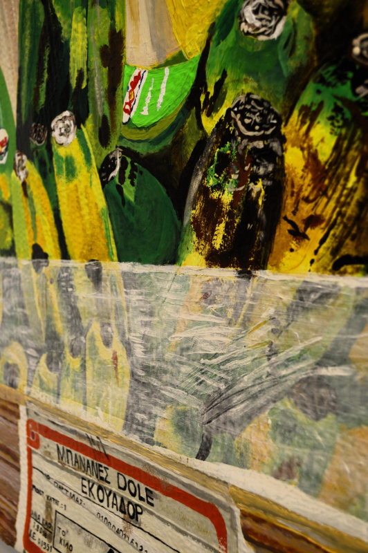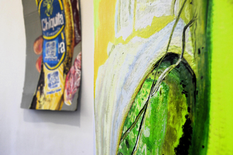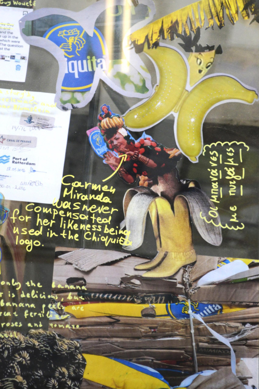 The collaborative project investigates the histories and symbolisms of bananas. It delves deep into the context provided by the common and oversaturated symbol of the fruit through large-scale paintings on found cardboard and large sculptures by Lotta Esko carved from found materials. Fruits, Unite! asks questions about why we consume tropical fruit in the West and how we view bananas in popular culture.