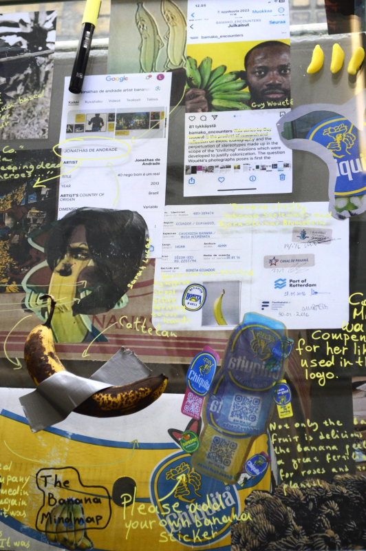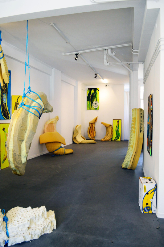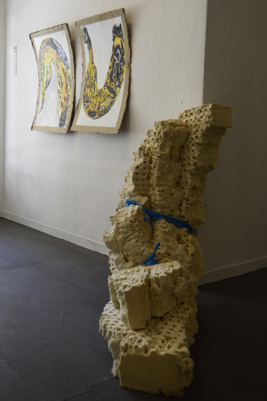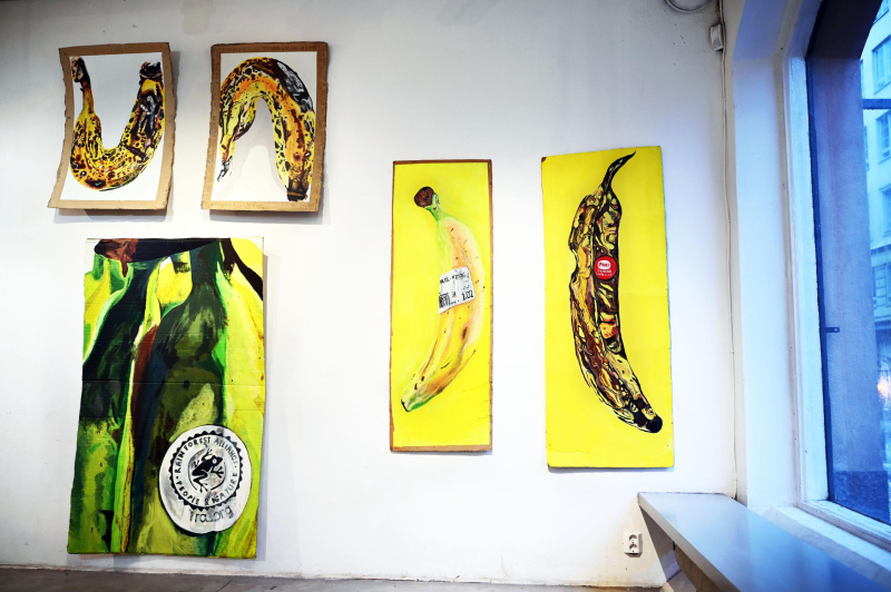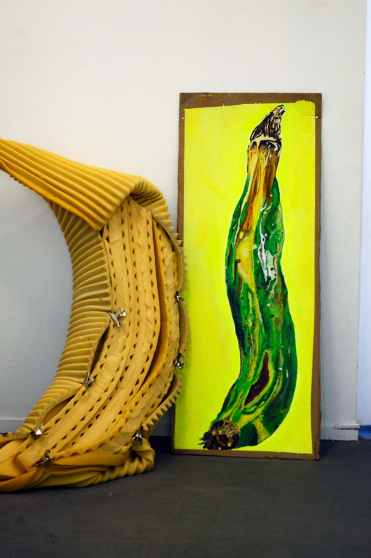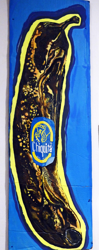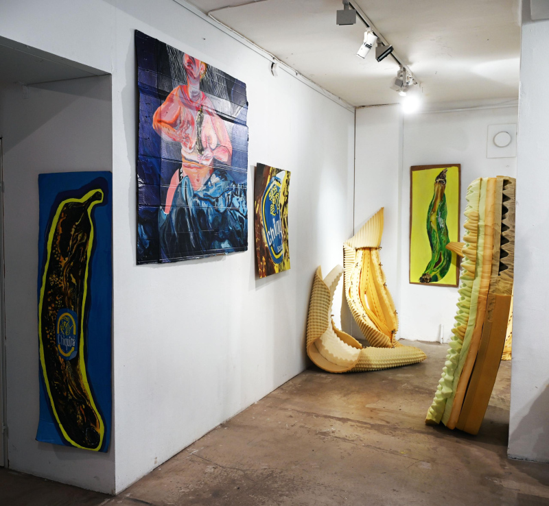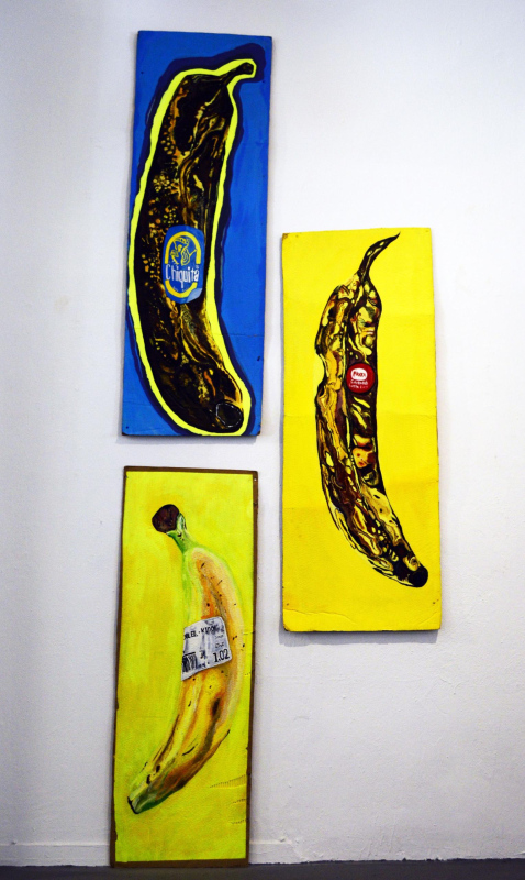 The collaborative project investigates the histories and symbolisms of bananas. It delves deep into the context provided by the common and oversaturated symbol of the fruit through large-scale paintings on found cardboard and large sculptures by Lotta Esko carved from found materials. Fruits, Unite! asks questions about why we consume tropical fruit in the West and how we view bananas in popular culture.