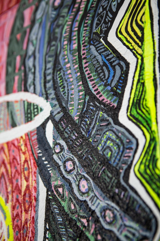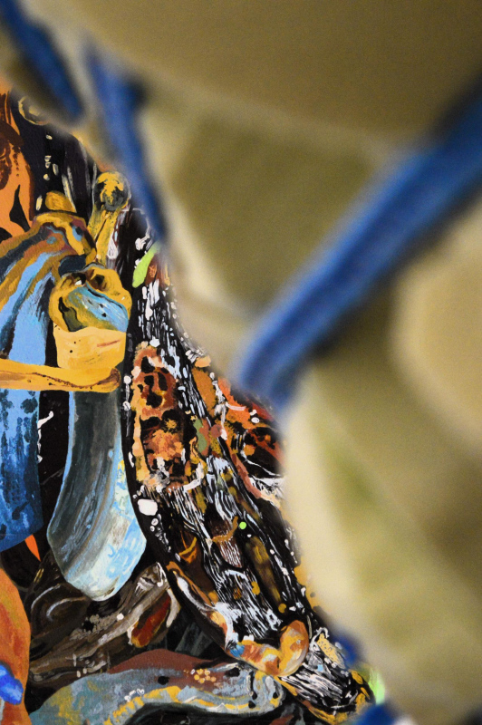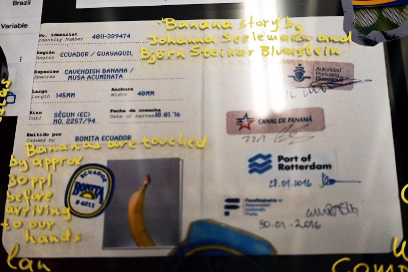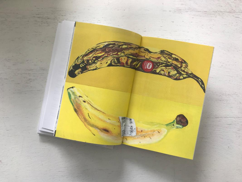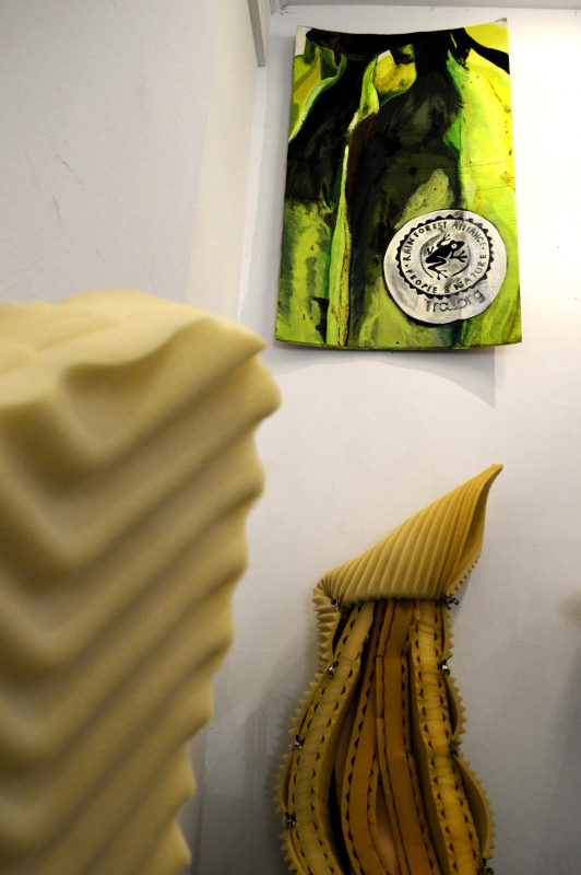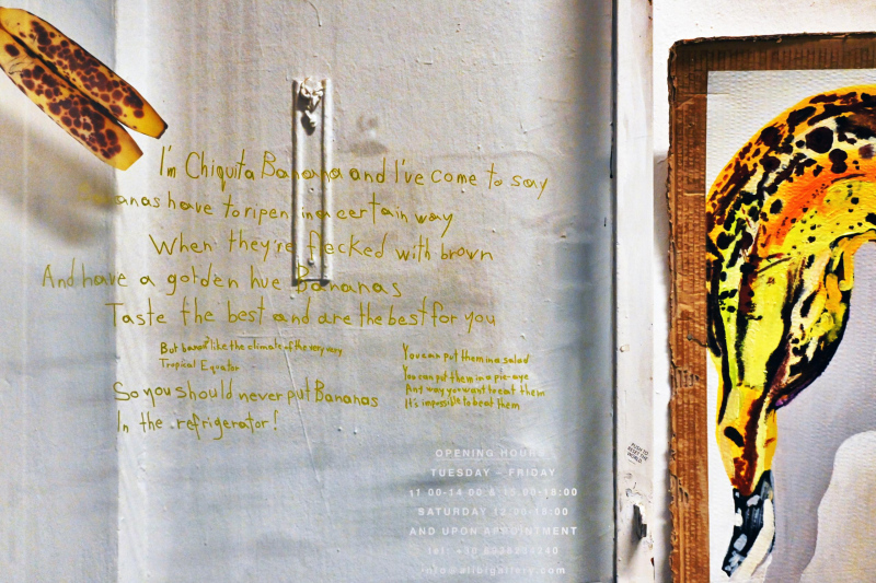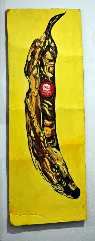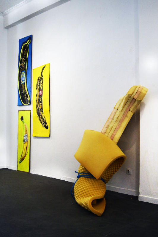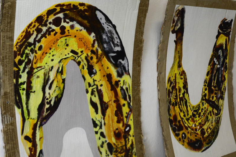 The collaborative project investigates the histories and symbolisms of bananas. It delves deep into the context provided by the common and oversaturated symbol of the fruit through large-scale paintings on found cardboard and large sculptures by Lotta Esko carved from found materials. Fruits, Unite! asks questions about why we consume tropical fruit in the West and how we view bananas in popular culture.