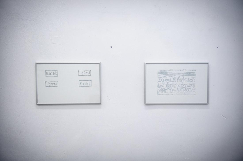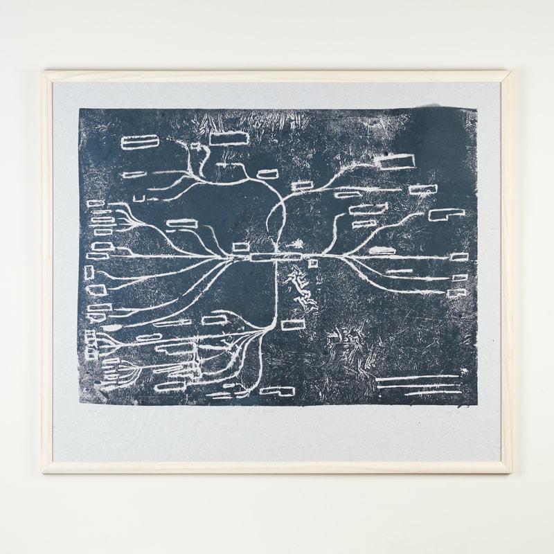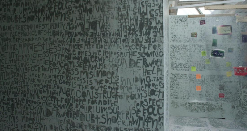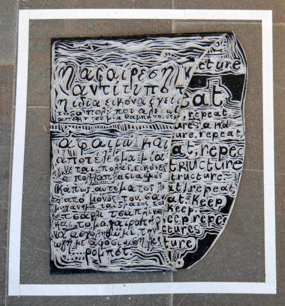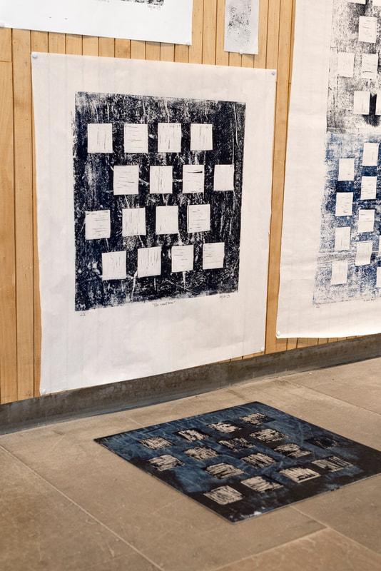 Notes ii included a series of prints, sketches, notes and carved linoleum. The artworks included imagery and phrases based the theme of artistic process and its transparent presentation within the final art object. Words such as structure, reproduction and subtraction as well as grid formations and repetitive line formations heavily featured.