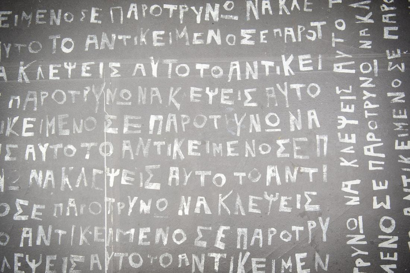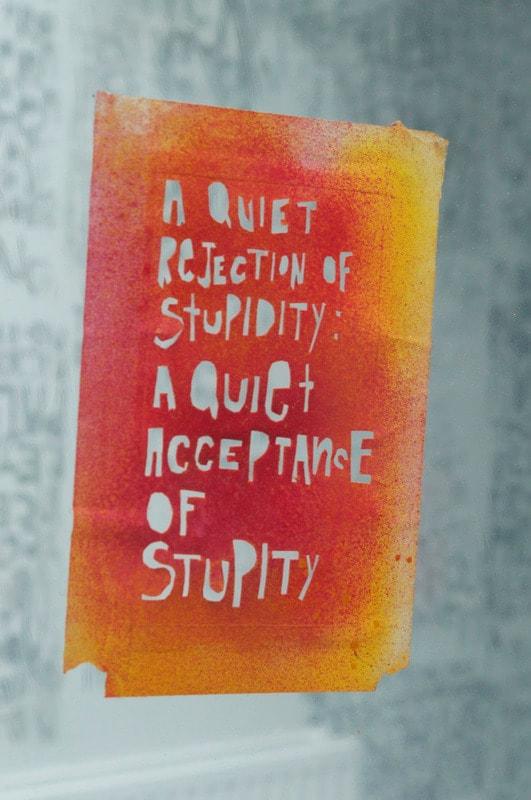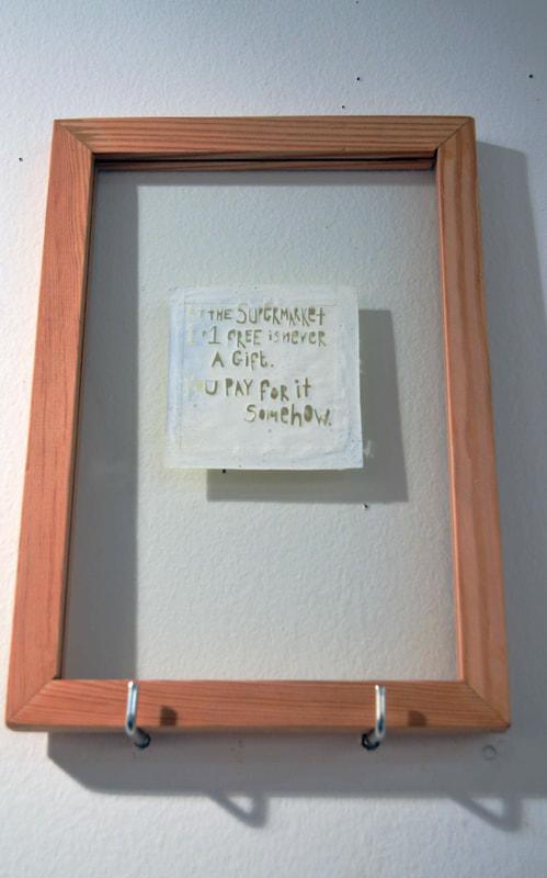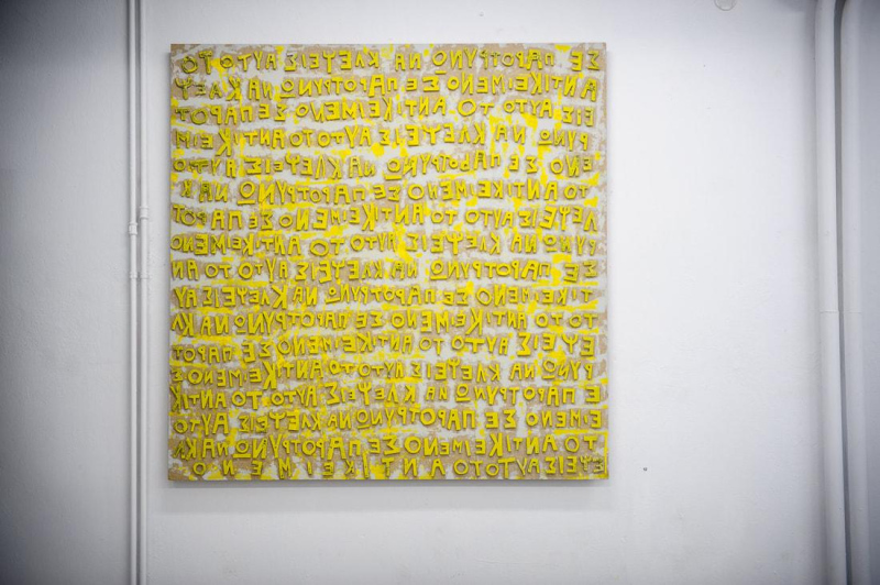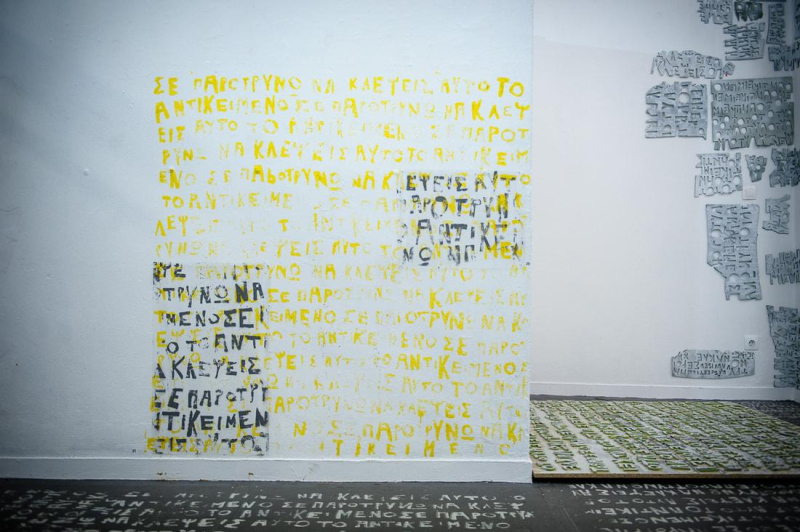 Participating artist in Art Athina with Alibi Gallery, Athens Conservatory, Athens, Greece, 2018Commissioned for the Art Athina Art Fair by Alibi Gallery in 2018. A 1sqm stamp was used to stamp the temporary vinyl flooring of the booth and read: THIS UTTERANCE IS UNTRANSLATABLE AND PRICELESS. THIS UTTERANCE IS CHEAP. Three stencils on post-it notes were encased in double-sided glass and placed by the stanp. Texts such as: AT THE SUPERMARKET 1+1 FREE IS NEVER A GIFT. YOU PAY FOR IT SOMEHOW. and UNTRANSLATABLE UNSUSTAINABLE UNATTAINABLE CHEAP were carved into the small stecils and added to the themes of the works; values within written language in the art field.