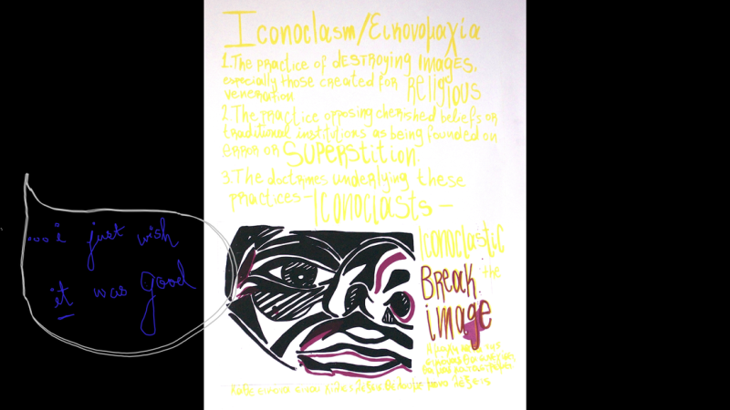 The focus on process, in a world where results are king, can be a marginal choice. It is a departure from the results-oriented proposals of capitalism, neoliberalism, and -isms. In this work I offered a peripheral utopian sketch. I took an audience on a virtual lockdown walk, collaging imagery and expressing the thoughts that came up. I discussed ways to live in incompleteness and ongoing-ness, presenting work and unwork; the constant non-labour and non-leisure in the home-studio, the kitchen-table studio, the home-office.